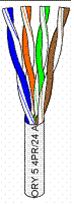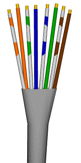 Hiernaast zie je een cat5 UTP kabel met 8 aders die in 4 paren bij elkaar horen: - paar 1: Wit-Blauw & Blauw - paar 2: Wit-Oranje & Oranje - paar 3: Wit-Groen & Groen - paar 4: Wit-Bruin & Bruin In de mantel zitten deze paren om elkaar heen gedraaid, getwist. Vandaar ook de naam "twisted pair kabel". |